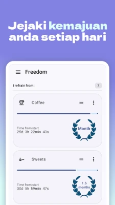 Bagaimana Freedom membantu anda mencapai matlamat? Aplikasi ini berfungsi sebagai buku log peribadi yang berkesan untuk memantau usaha anda. Anda dapat menjejaki tempoh masa sejak anda memulakan perubahan positif, sama ada sebagai pengira hari tanpa tabiat tertentu atau penjejak fokus harian. Dengan visualisasi kemajuan yang jelas, Freedom memaparkan statistik terperinci dan pencapaian penting (milestones), memberikan ganjaran motivasi yang anda perlukan untuk terus maju. Penggunaannya yang mudah memastikan anda sentiasa dimaklumkan tentang kemajuan anda, menjadikan setiap langkah ke hadapan lebih bermakna dan mendorong anda untuk berkata, "Saya bebas. Saya sihat."