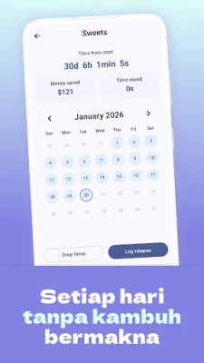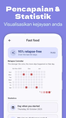 Selain itu, Freedom menawarkan ciri kalendar yang membolehkan anda menandakan tarikh-tarikh penting dan melihat rentetan kejayaan anda secara keseluruhan. Jejaki hari-hari bersih dan peningkatan jangka panjang dengan mudah. Untuk memastikan kemajuan anda sentiasa dalam pandangan, Freedom turut menyokong widget yang boleh dipaparkan di skrin utama peranti anda. Ini menjadikan pemantauan kebebasan anda daripada ketagihan rokok, alkohol, perjudian, internet, atau tabiat kompulsif lain seperti menggigit kuku, lebih mudah dan konsisten. Freedom adalah teman praktikal yang menyediakan peringatan lembut, sokongan moral harian, dan analisis kemajuan yang jelas untuk membantu anda mencapai perubahan hidup yang sebenar dan berpanjangan.