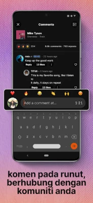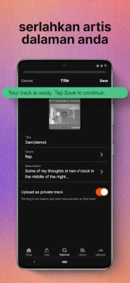 Kembangkan koleksi audio anda dengan mudah, menyimpan lagu-lagu terkini yang sedang trend, adunan semula underground, dan potongan dalam yang merangsang jiwa. Bina senarai main peribadi yang mencerminkan cita rasa anda dan kongsinya dengan dunia. SoundCloud bukan sekadar aplikasi muzik; ia adalah komuniti yang hidup. Berinteraksi langsung dengan artis kegemaran anda dan peminat muzik lain, bertukar-tukar penemuan dan inspirasi. Luahkan penghargaan anda dengan menyukai, memposting semula, atau memberi komen pada mana-mana runut, dan sebarkan kegembiraan muzik merentasi aplikasi dan platform media sosial. Lebih dari itu, SoundCloud memberi peluang kepada pencipta muzik: muat naik karya anda sendiri dan jangkau pangkalan peminat global, seterusnya membantu artis bebas menjana pendapatan melalui strim yang dikuasakan peminat.